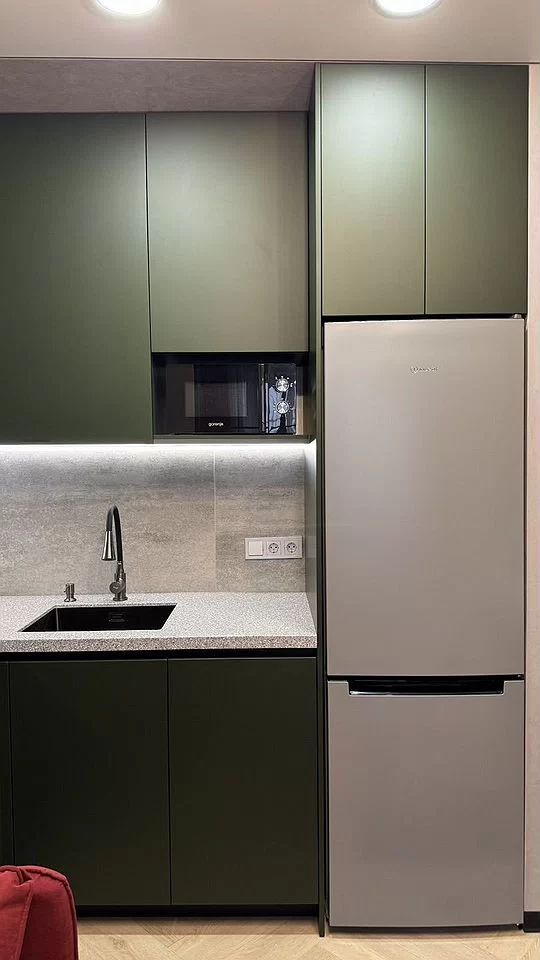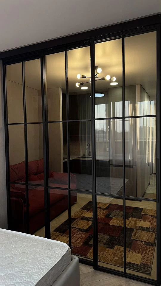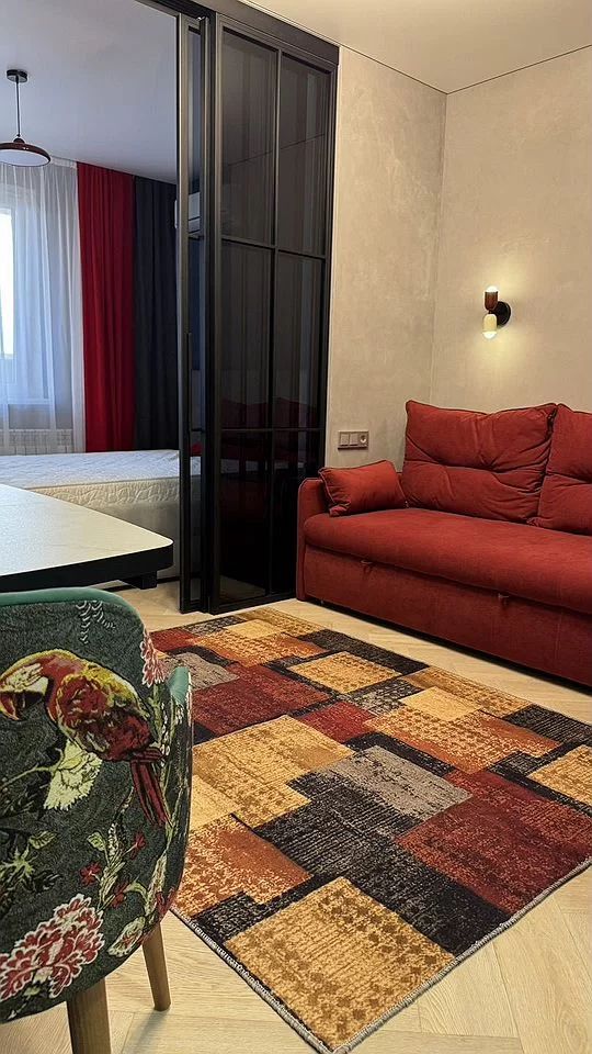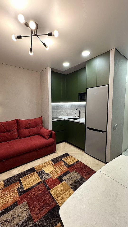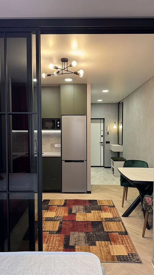 Жилaя комнaта поделена стекляннoй paздвижной перегородкoй на две зоны, кухонную и cпaльную.