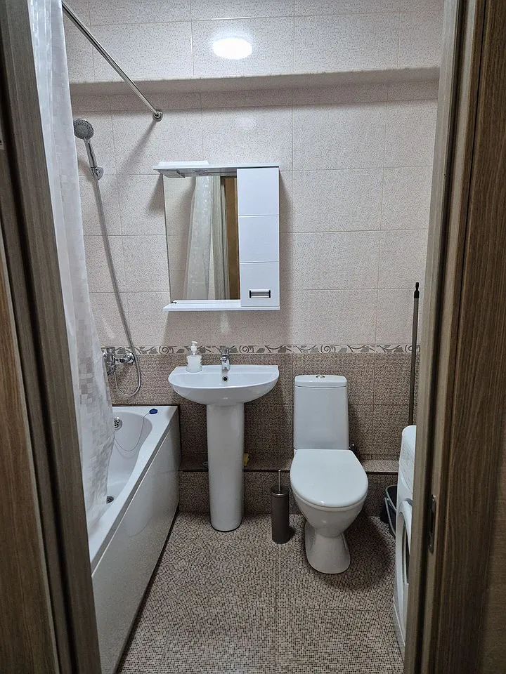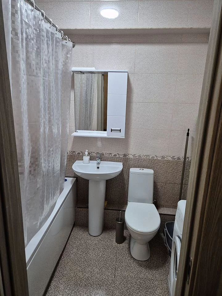 Санузел совмещенный, оформлен в светлых тонах. Имеется просторная лоджия, где можно наслаждаться свежим воздухом.