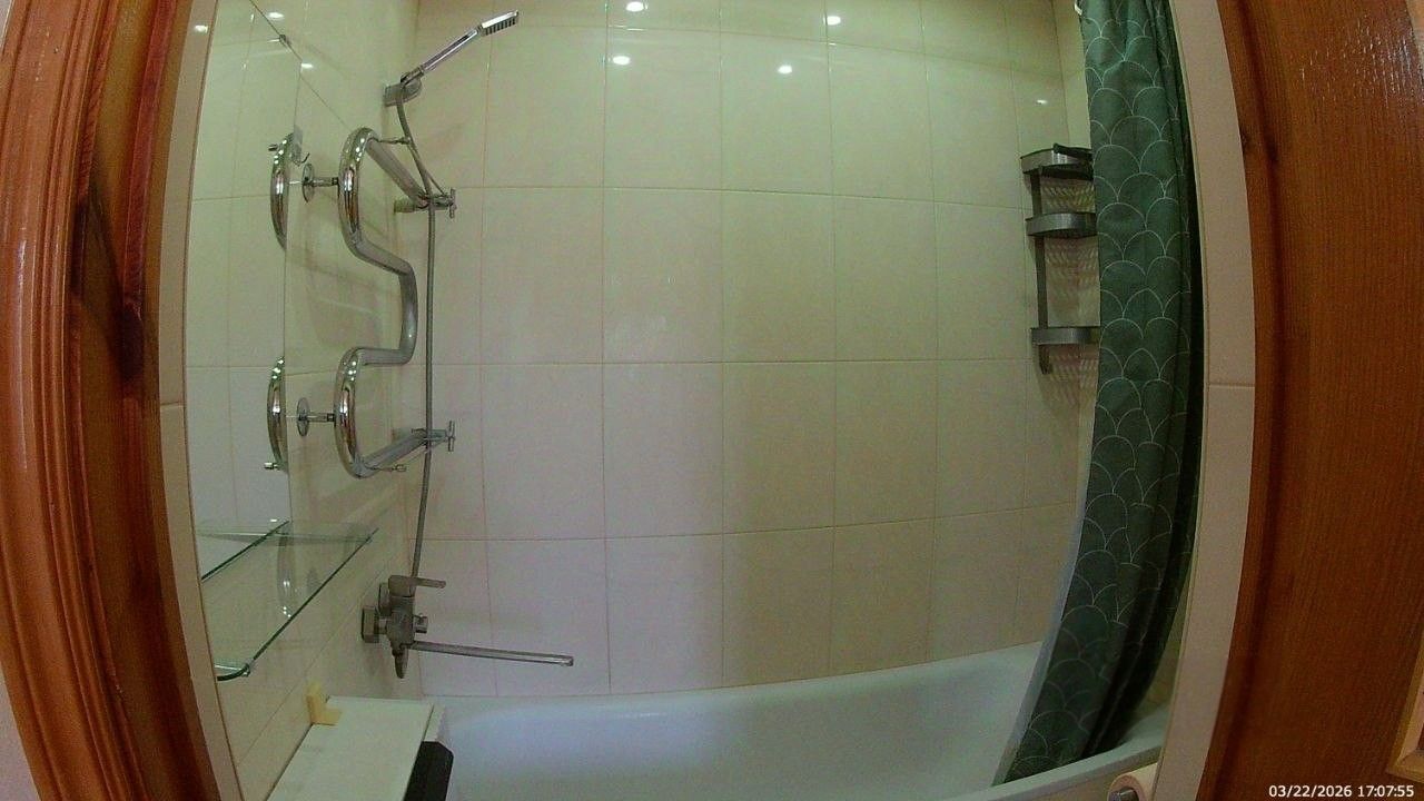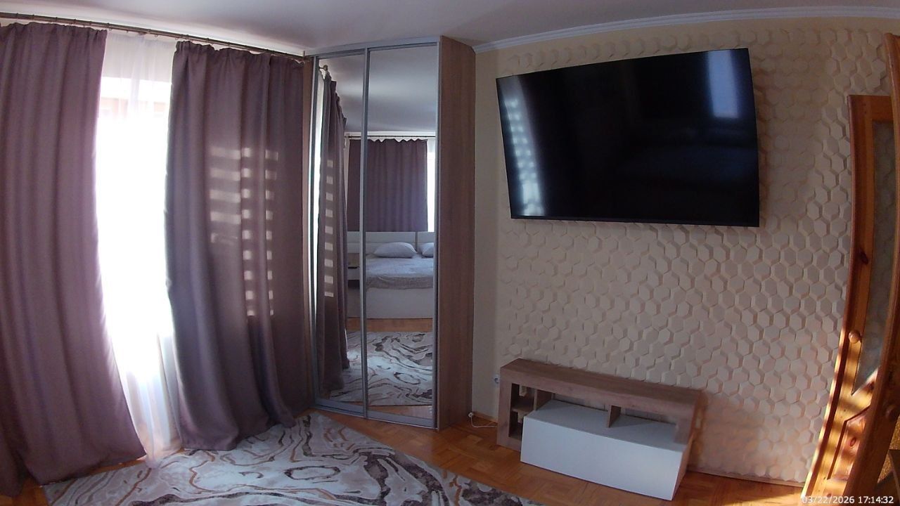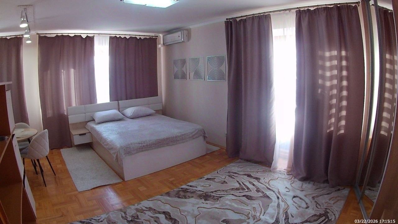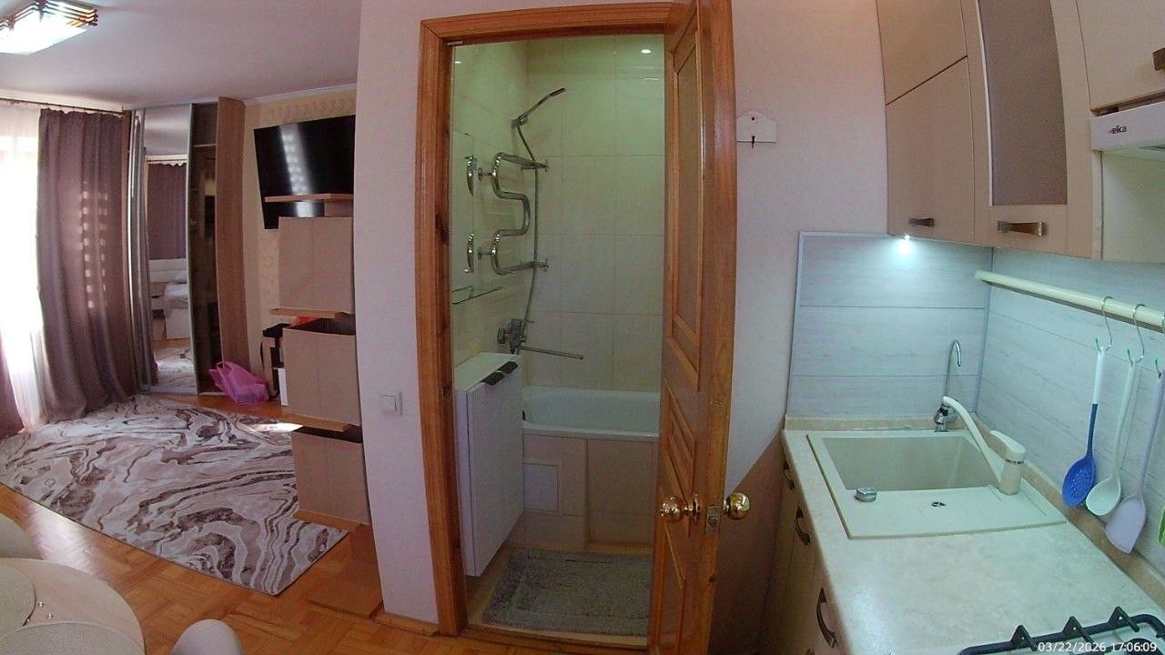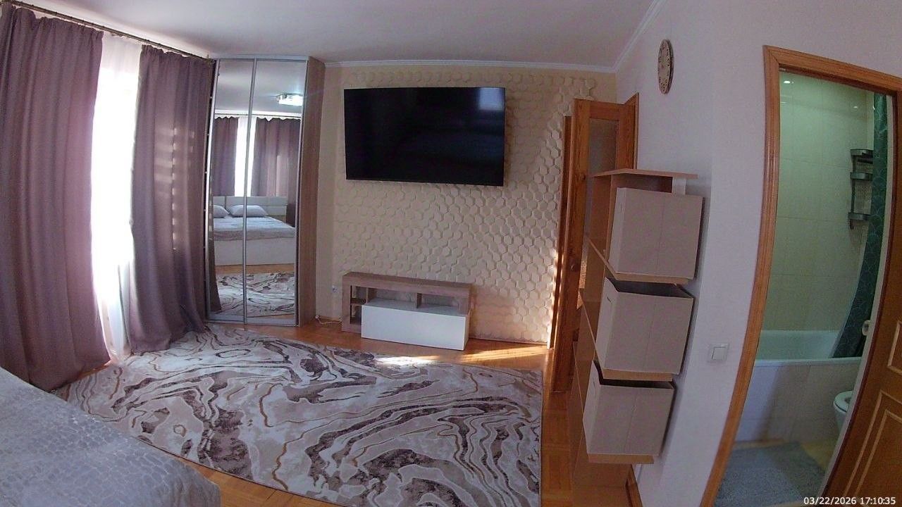 Санузел совмещенный, оборудован ванной. В ванной комнате находится газовая колонка, обеспечивающая бесперебойным горячим водоснабжением. Из окон открывается вид как на улицу, так и во двор, что позволяет наслаждаться свежим воздухом. Балкон полностью обшит деревом. В гостиной весит телевизор 65 дюймов. В комнате есть кондиционер и двухспальная кровать. Хороший паркетный пол. Отопление скрыто в деревянные решётки и деревянные подоконники. Все окна и двери деревянные.