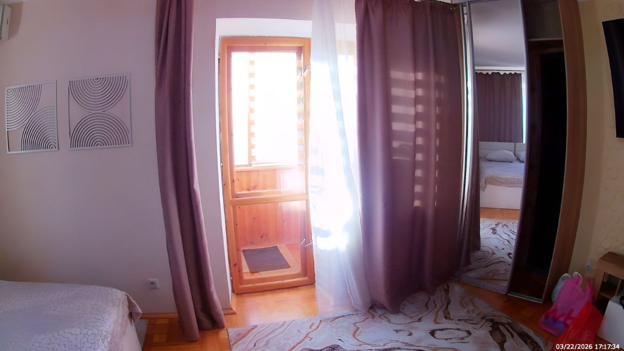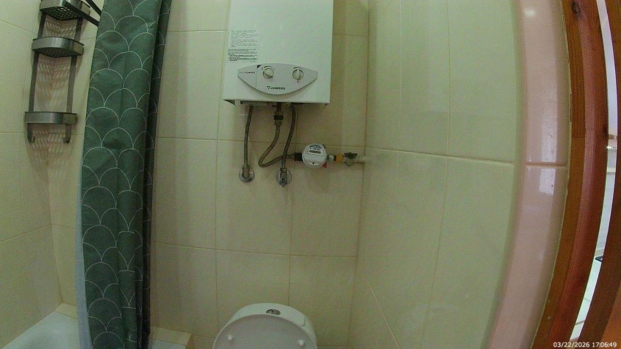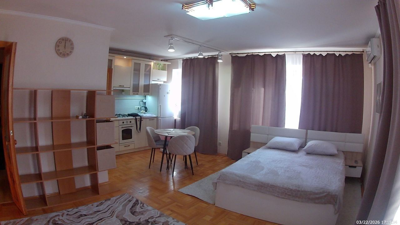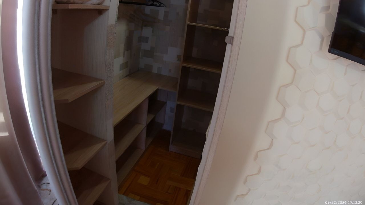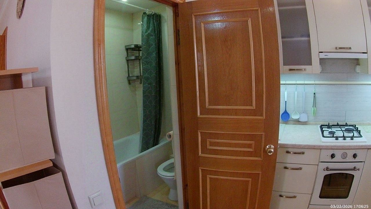 Санузел совмещенный, оборудован ванной. В ванной комнате находится газовая колонка, обеспечивающая бесперебойным горячим водоснабжением. Из окон открывается вид как на улицу, так и во двор, что позволяет наслаждаться свежим воздухом. Балкон полностью обшит деревом. В гостиной весит телевизор 65 дюймов. В комнате есть кондиционер и двухспальная кровать. Хороший паркетный пол. Отопление скрыто в деревянные решётки и деревянные подоконники. Все окна и двери деревянные.