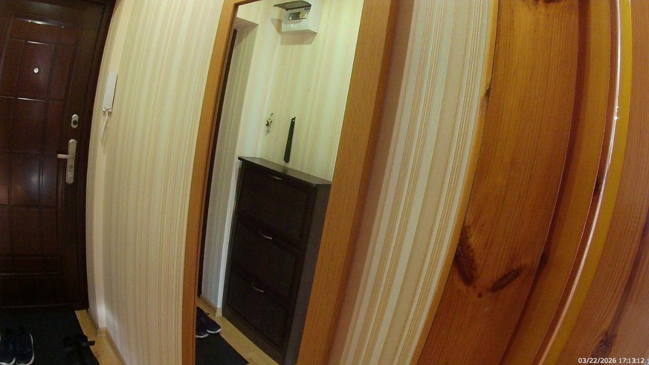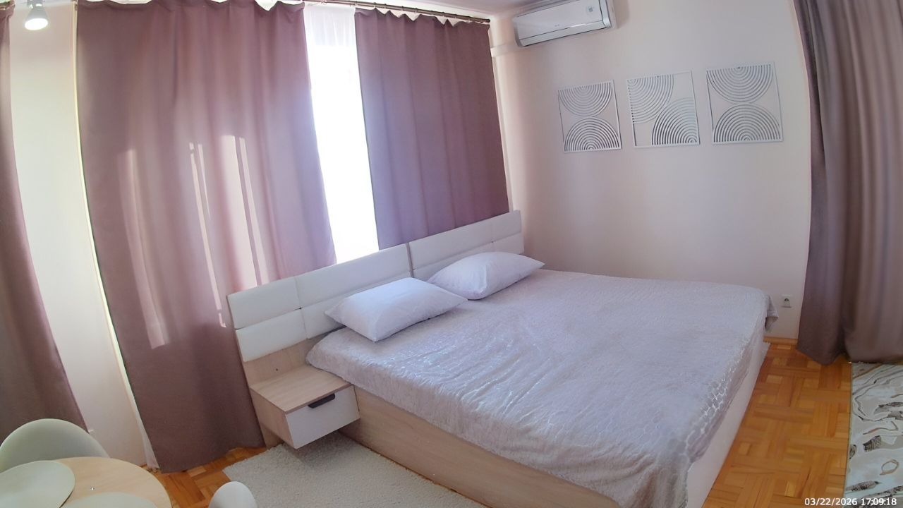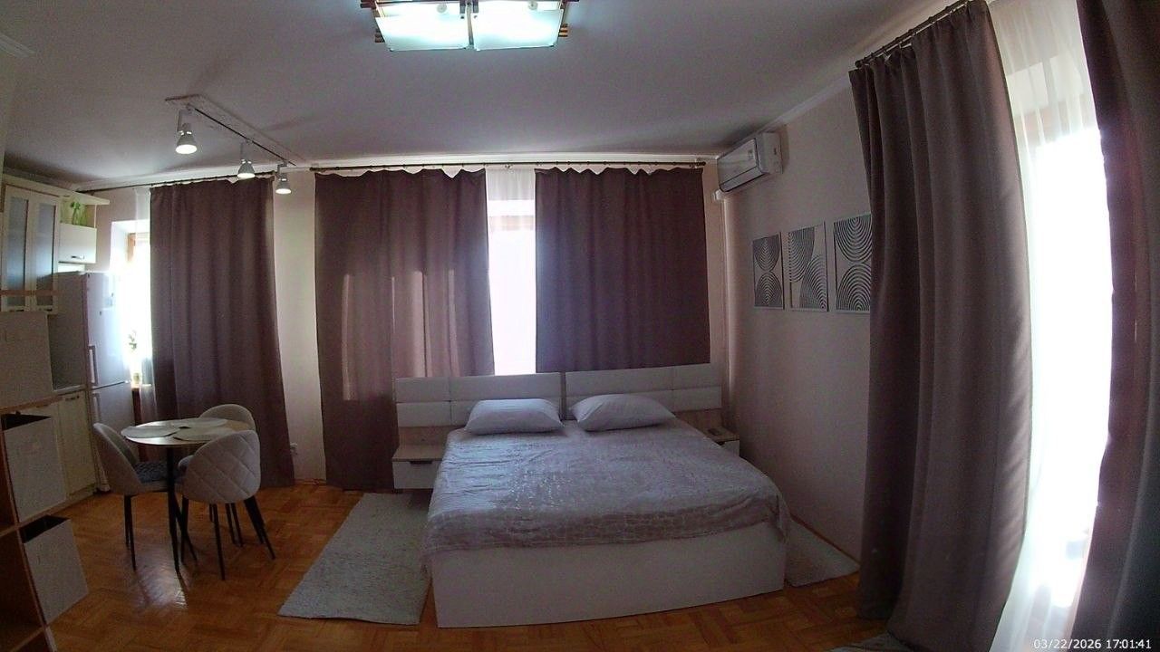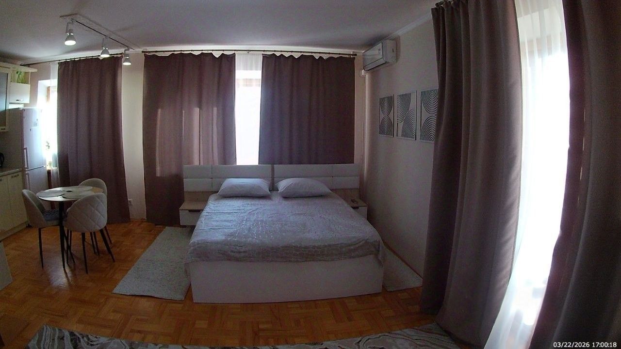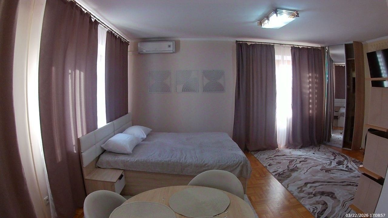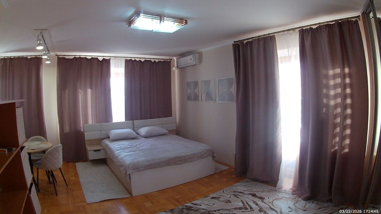 Санузел совмещенный, оборудован ванной. В ванной комнате находится газовая колонка, обеспечивающая бесперебойным горячим водоснабжением. Из окон открывается вид как на улицу, так и во двор, что позволяет наслаждаться свежим воздухом. Балкон полностью обшит деревом. В гостиной весит телевизор 65 дюймов. В комнате есть кондиционер и двухспальная кровать. Хороший паркетный пол. Отопление скрыто в деревянные решётки и деревянные подоконники. Все окна и двери деревянные.