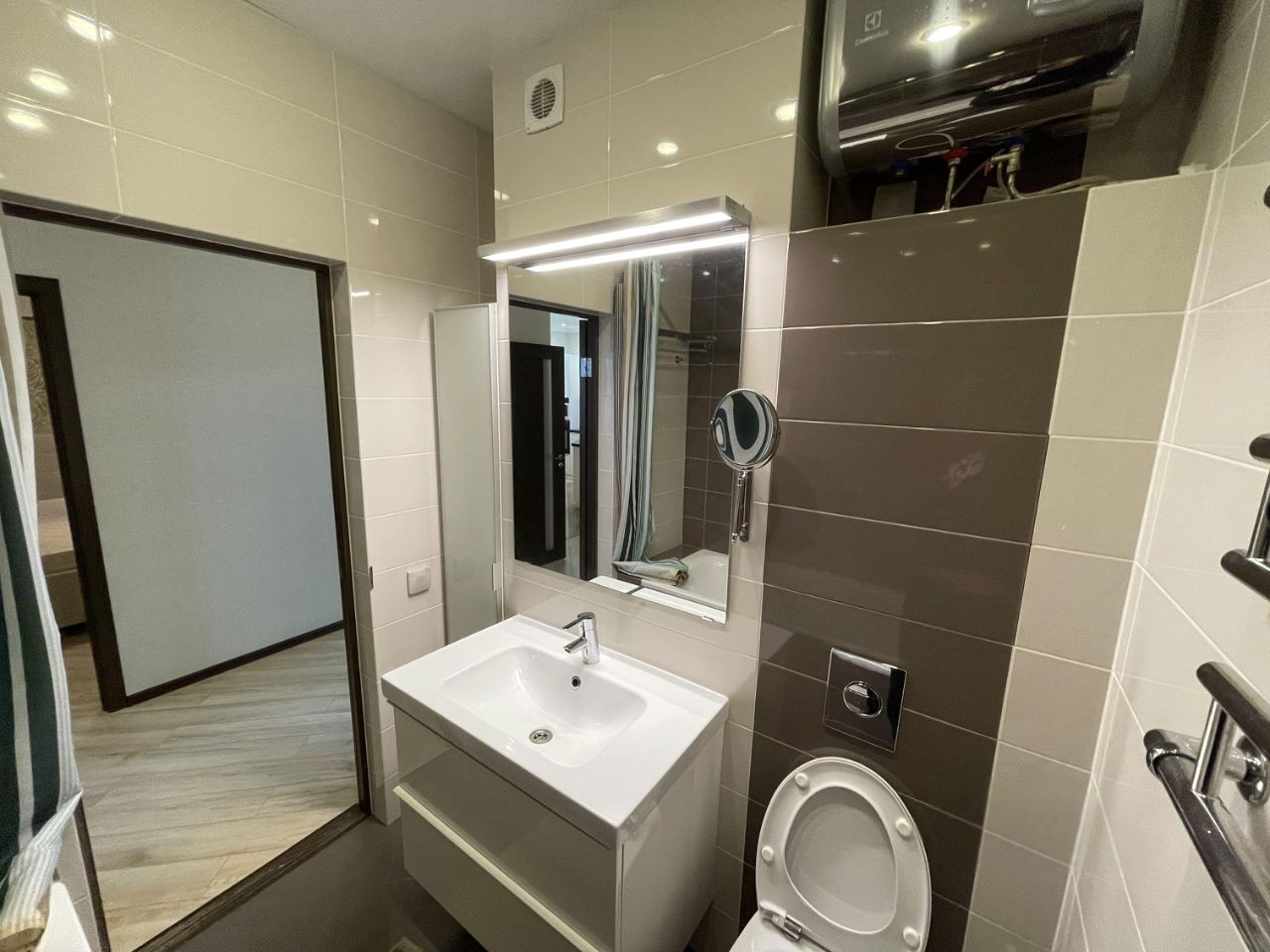 В санузле сантехника Grohe, в ванне смеситель с терморегулятором, бойлер на случай отсутствия горячей воды.