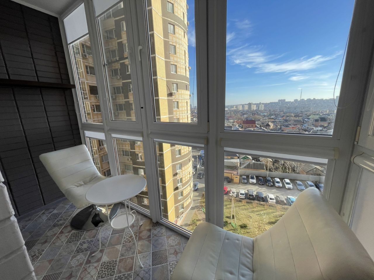 В зале большой раскладной диван и выход на панорамную лоджию.
