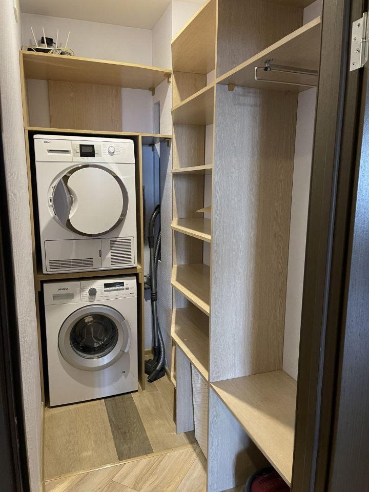 Подсобная комната с большим местом для хранения вещей, сушильной машиной и стиральной машиной Siemens.