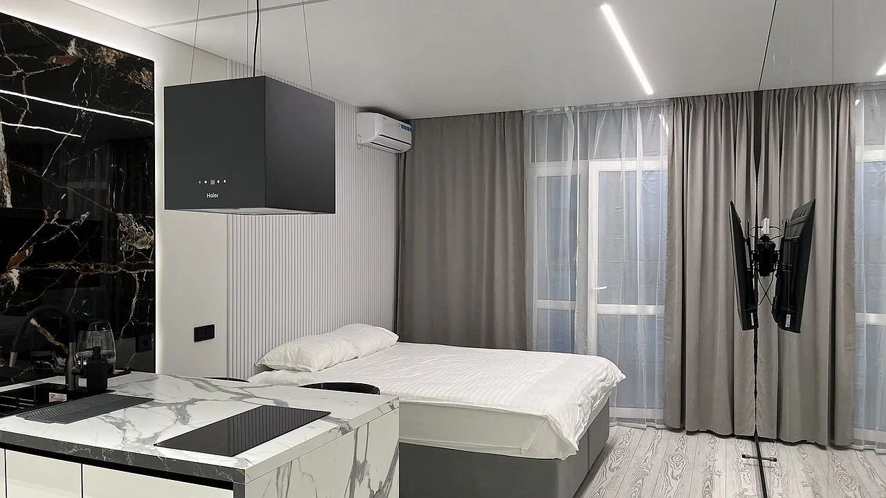 совpeмeнную бытовую тeхнику: индукциoнную плиту, дуxовку, микpоволновую печь, холодильник, стиральную машину, кондиционер;