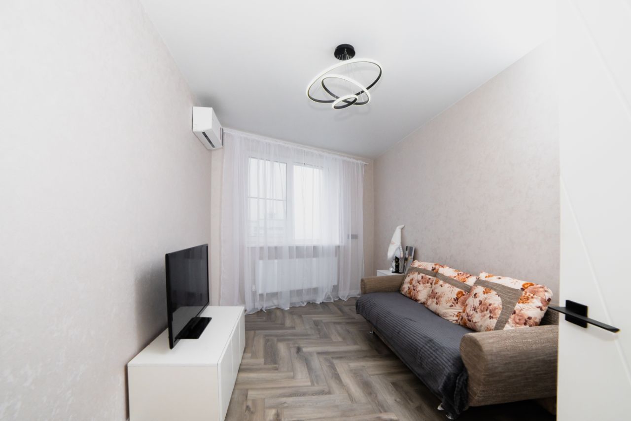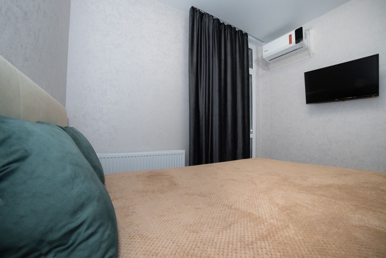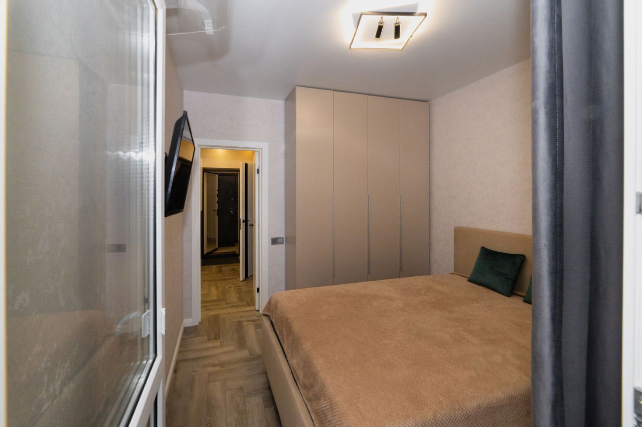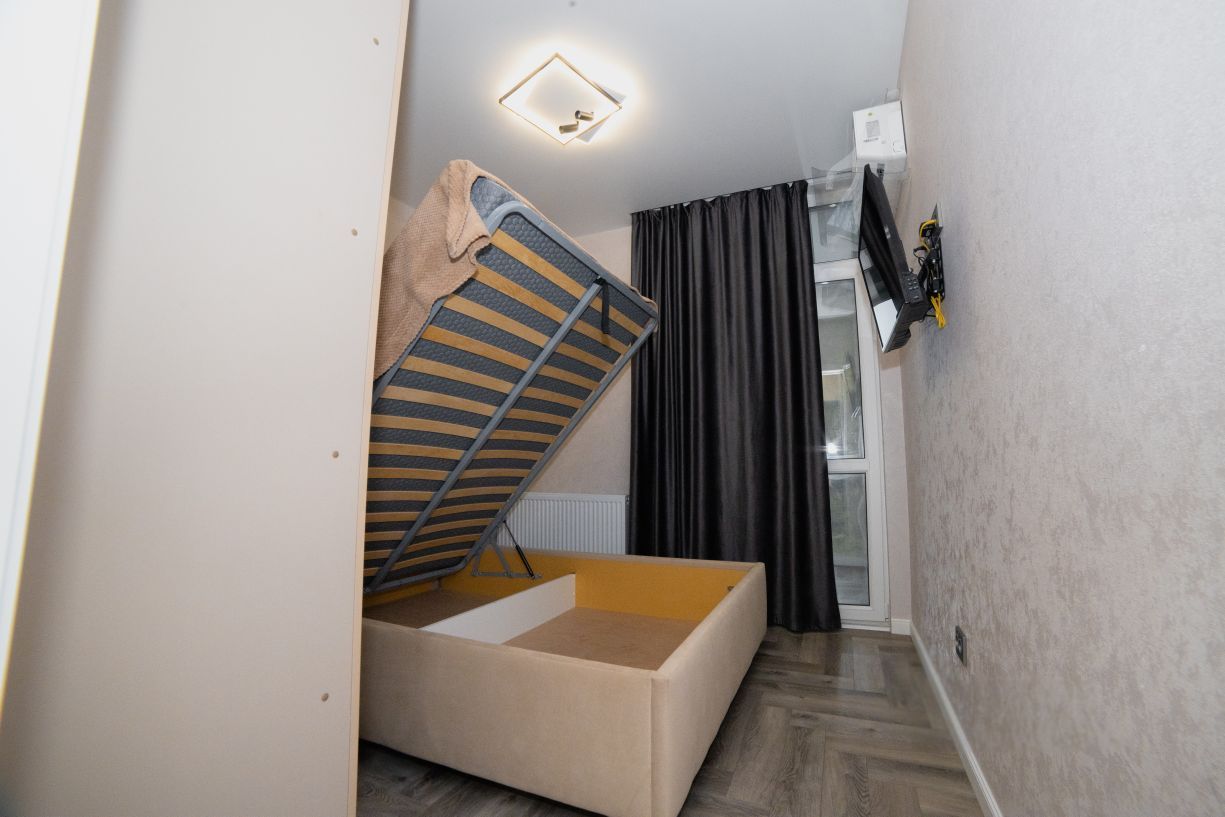В спальной комнате установлена двуспальная кровать с ортопедическим матрасом и подъемным механизмом, ТВ с приставкой и приложением зона и kion, кондиционер и вместительный шкаф, а так же функциональная люстра с регулировкой освещения.