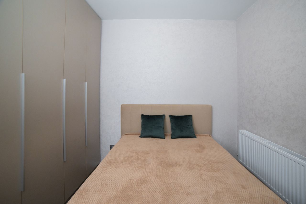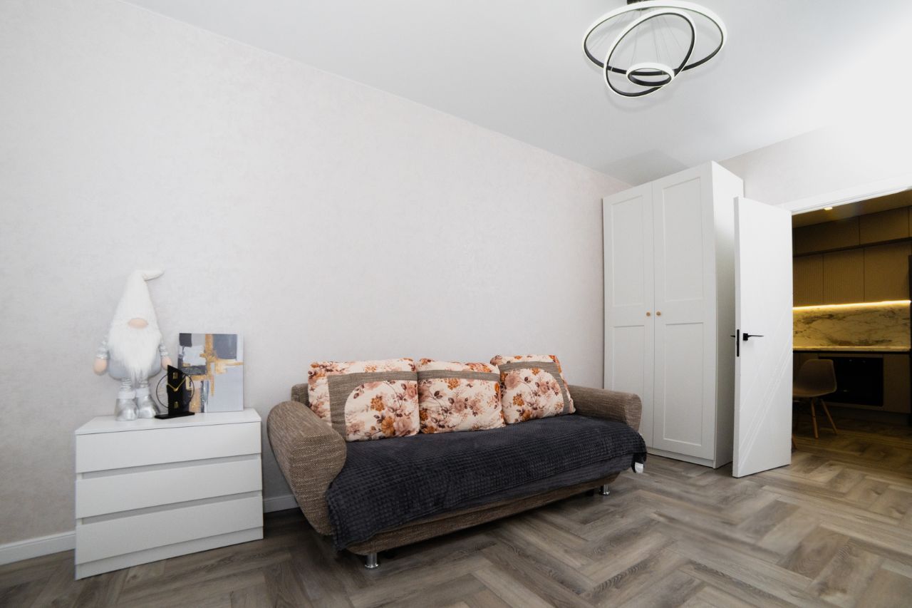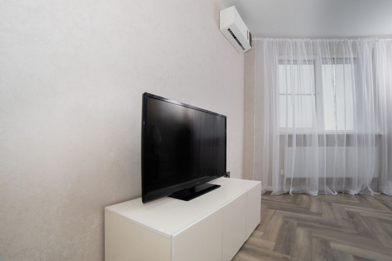 В спальной комнате установлена двуспальная кровать с ортопедическим матрасом и подъемным механизмом, ТВ с приставкой и приложением зона и kion, кондиционер и вместительный шкаф, а так же функциональная люстра с регулировкой освещения.