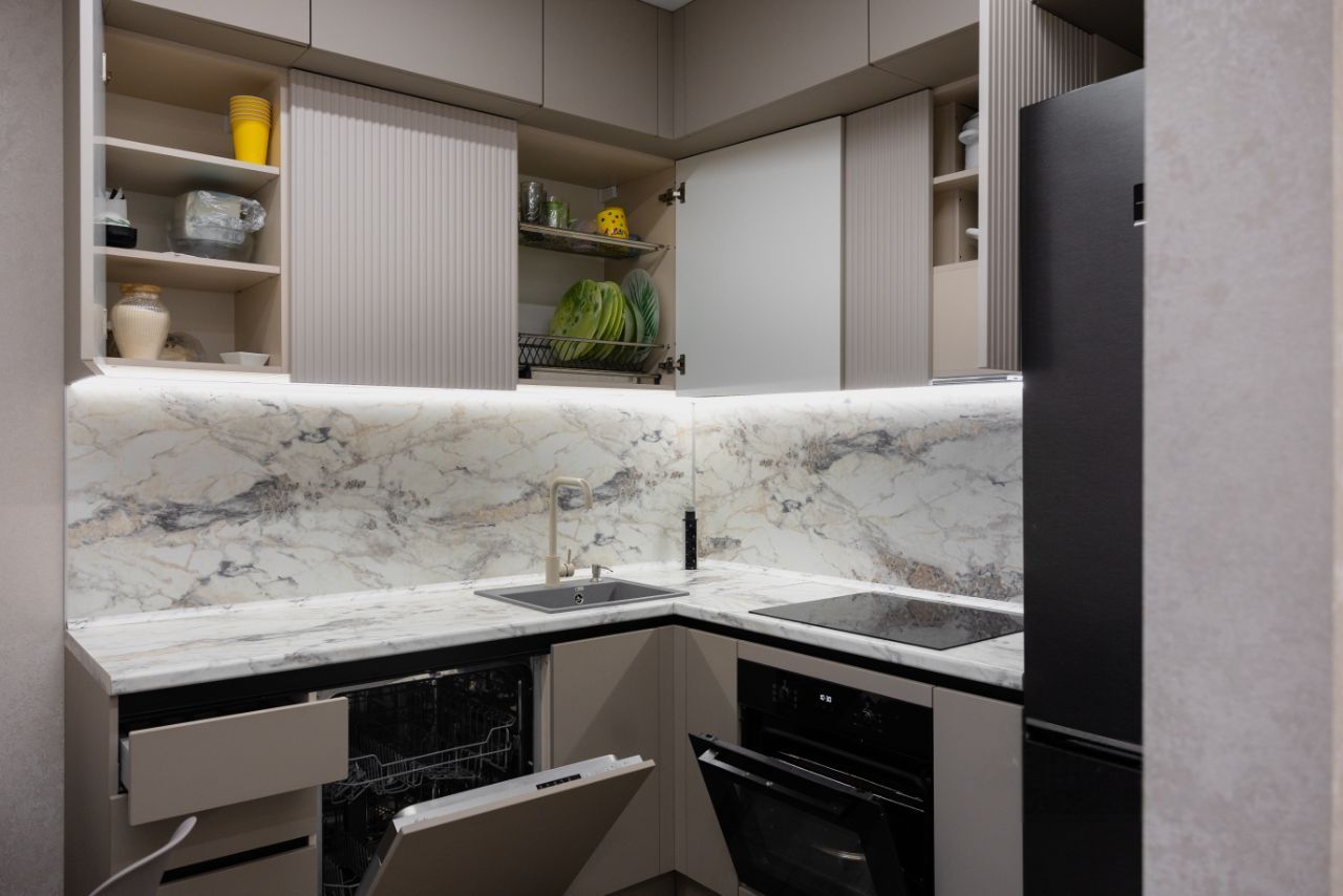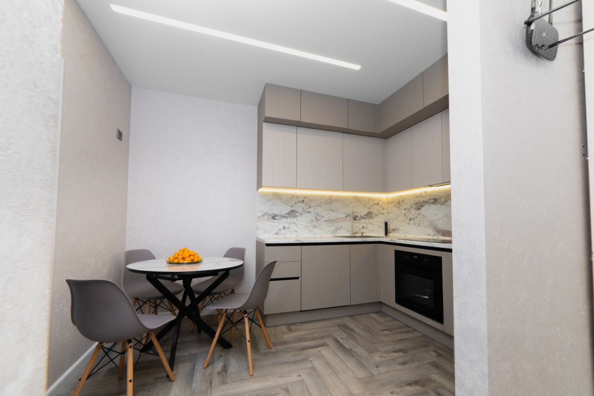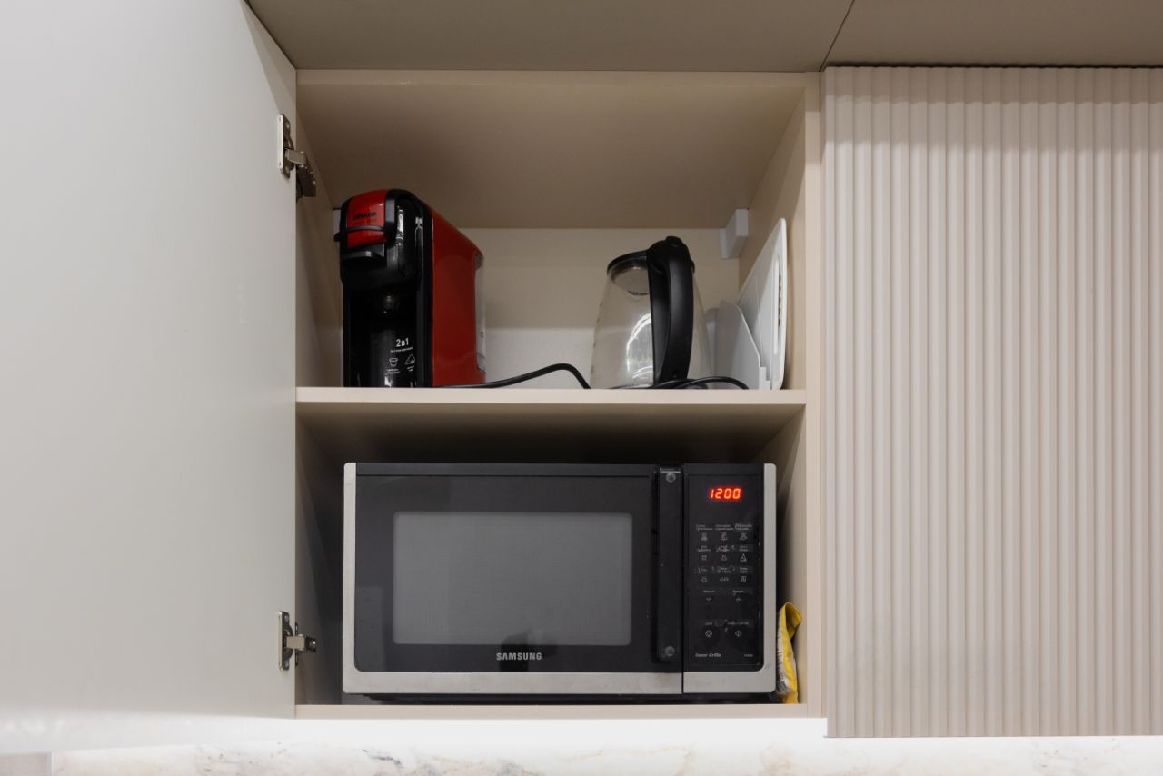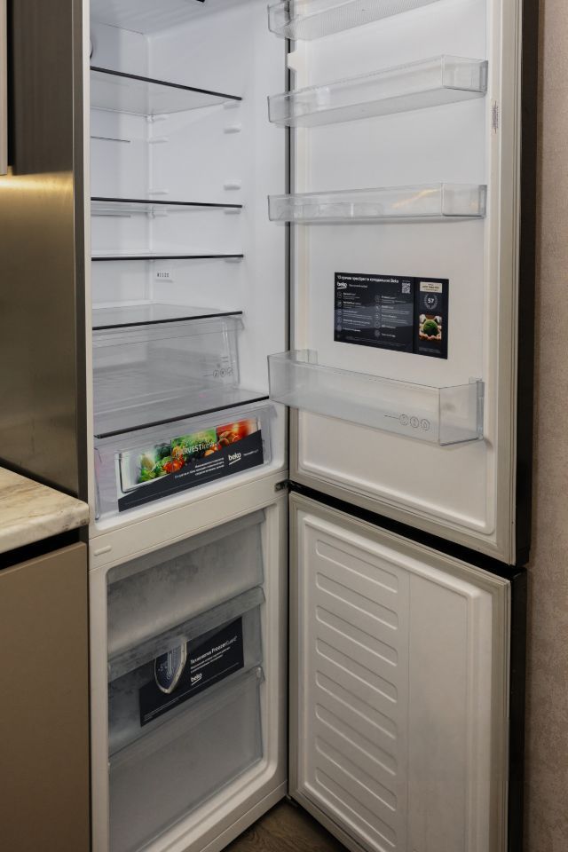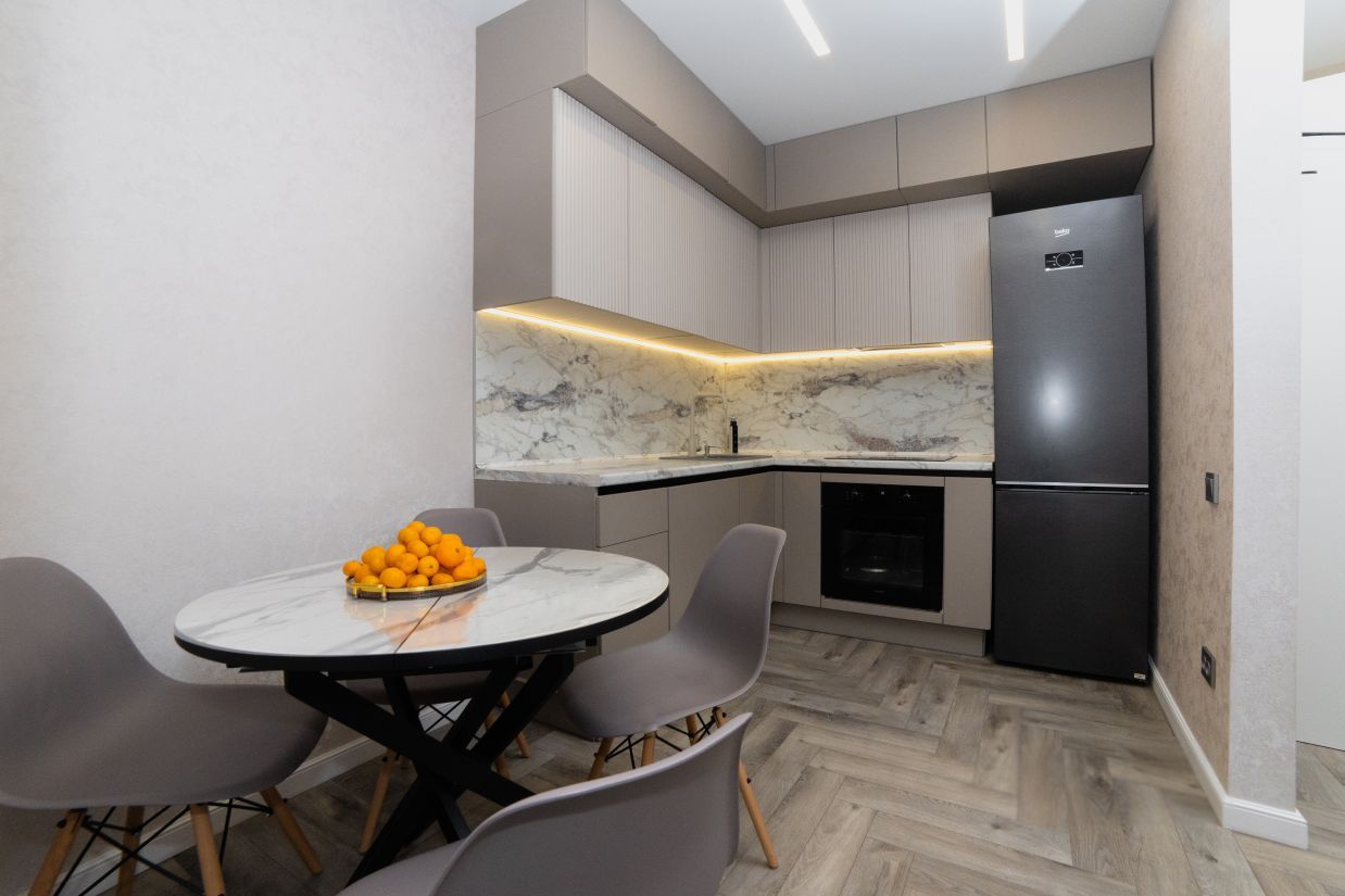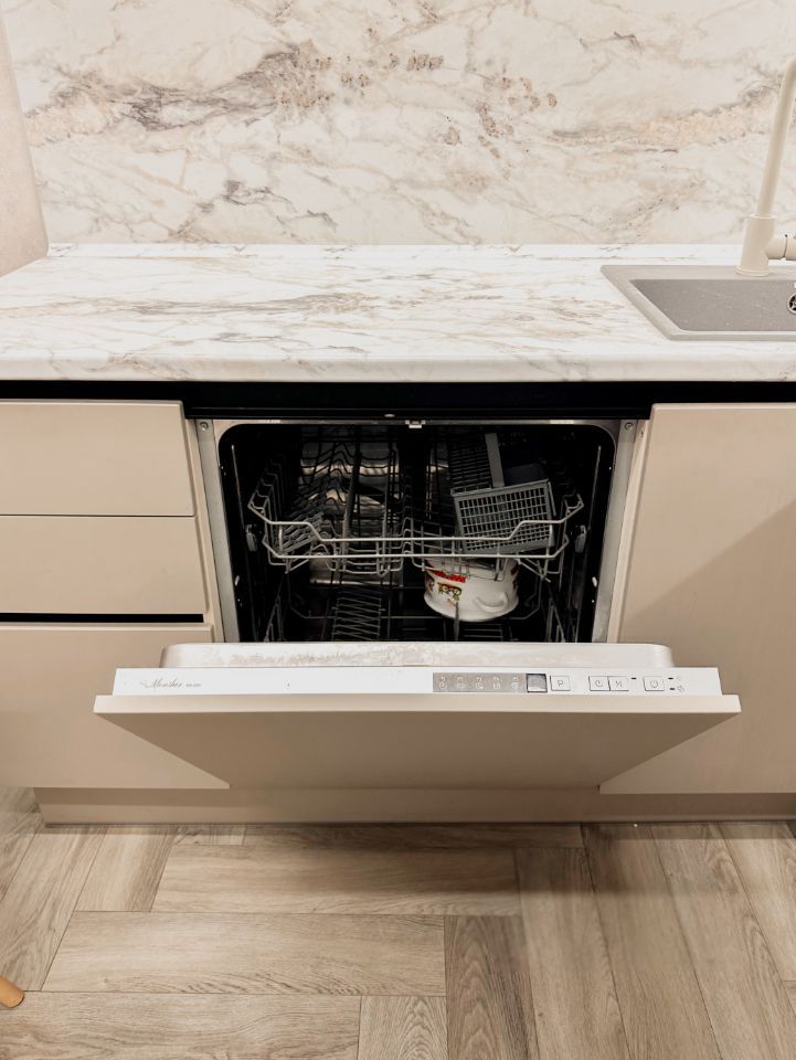 Кухня с качественной техникой (варочной панелью на 5 зон, духовой шкаф, вместительный двухкамерный холодильник, установлена посудомоечная машина 60см). Так же микроволновая печь, встраиваемая выдвижная розетка, кофемашина, электрический чайник, набор посуды для комфортного проживания, оборудована уютная обеденная зона.