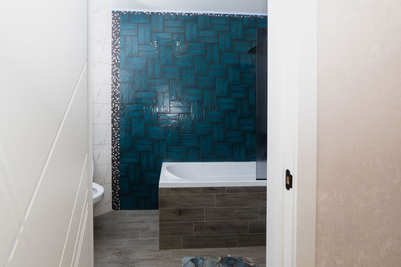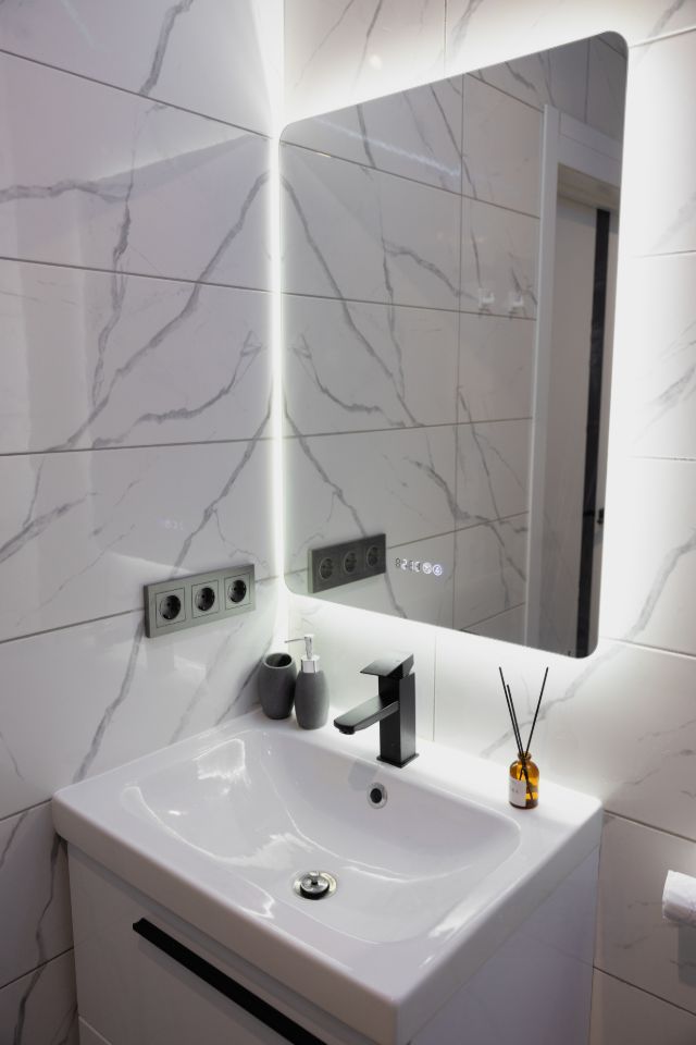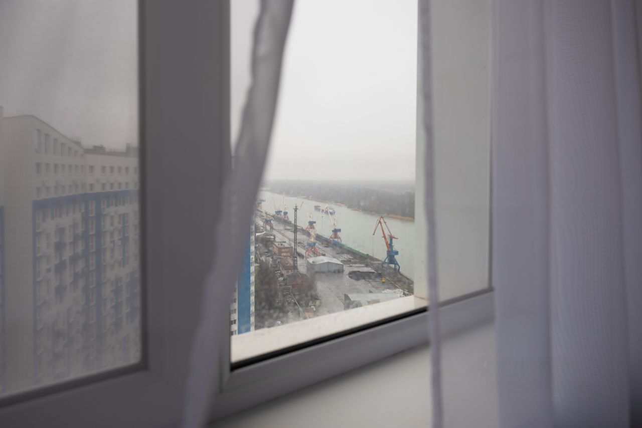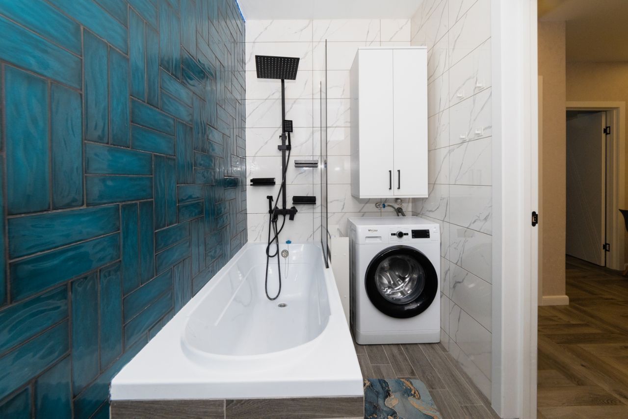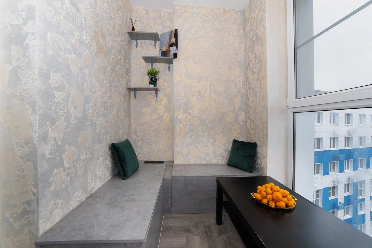 Дизайнерская плитка в совмещённом санузле, установлена просторная ванная, стиральная машина-60см, шкафы для полотенец и химии, а так же неоновая подсветка, вытяжка. На лоджии оборудовано место для отдыха и хранения со встраиваемой выдвижной розеткой и панорамным остеклением с видом на Дон и Зеленый остров.