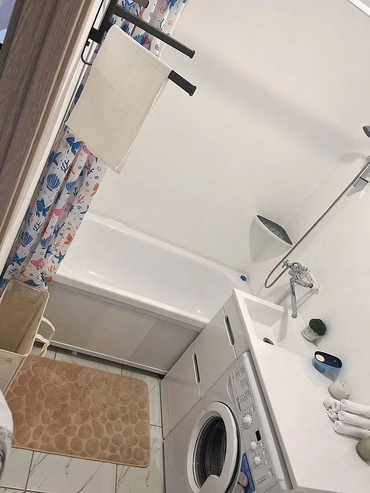 В квартире совмещенный санузел с современной сантехникой. Балкон застеклен, что позволяет использовать его как дополнительное пространство для отдыха.