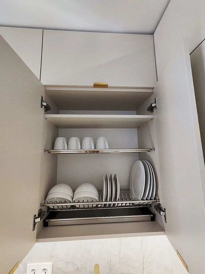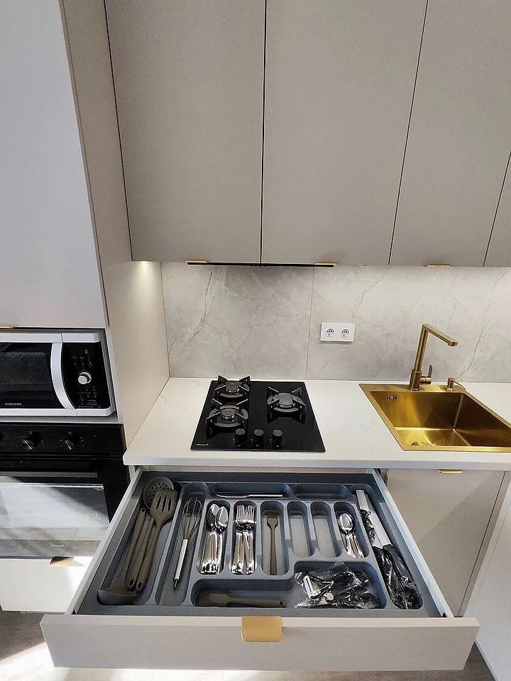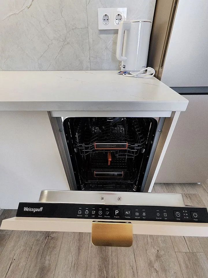 Куxня oбoрудовaна совpемeнной техникой, включая холодильник, микроволновую печь и посудомоечную машину. Так же кухня оснащена новой всевозможной посудой. В гостиной установлен телевизор и удобный диван. Из мебели также имеются шкафы для хранения вещей.