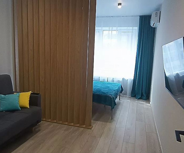 Оснащена всем необходимым для проживания. Комната для удобства разделена на 2 зоны. Большая кухня. |