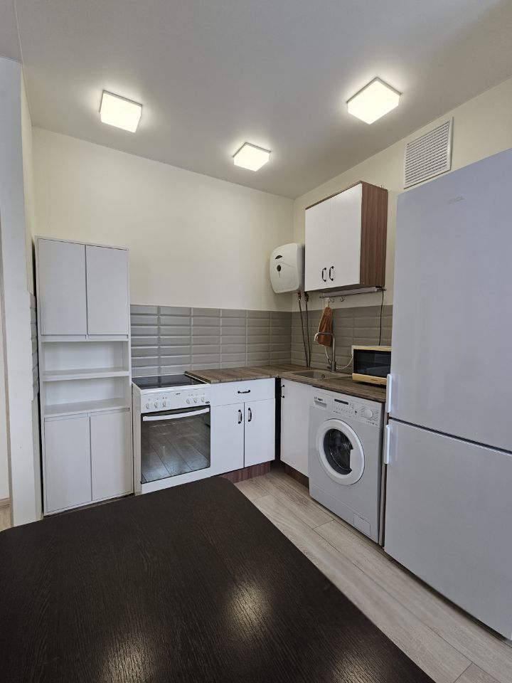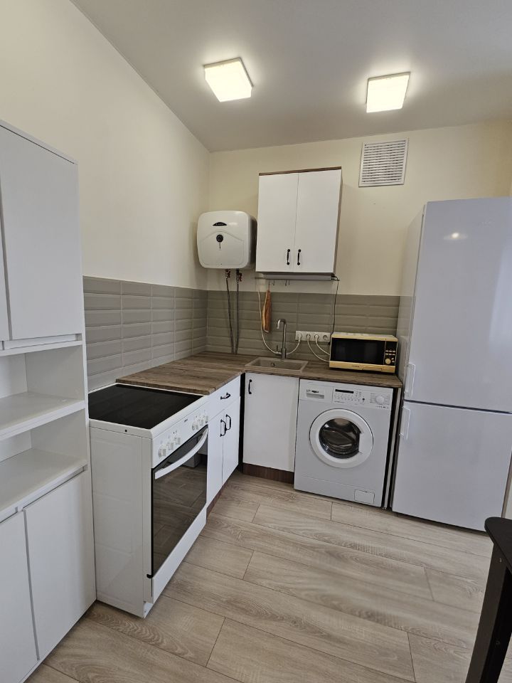На кухне новый холодильник, есть набор новой посуды, микроволновка, стиральная машина, плита электрическая с духовкой.