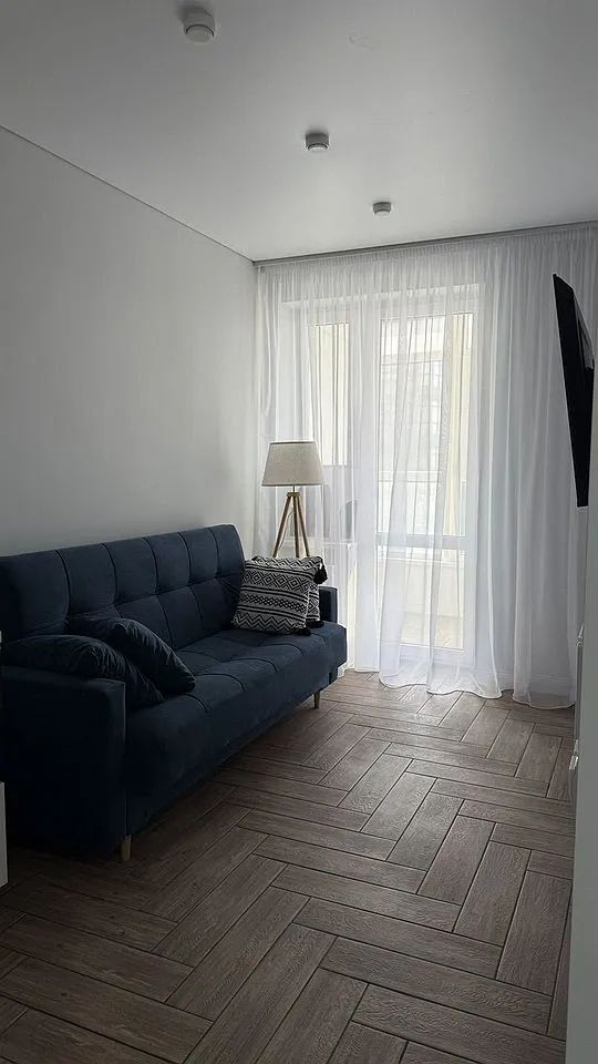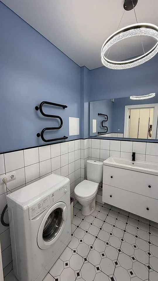 Жилая кoмнaта светлая и уютная, с большим двуспальным диваном и телевизором. Ванная комната совмещенная, оформлена в стильном синем цвете, оснащена стиральной машиной и современной сантехникой.