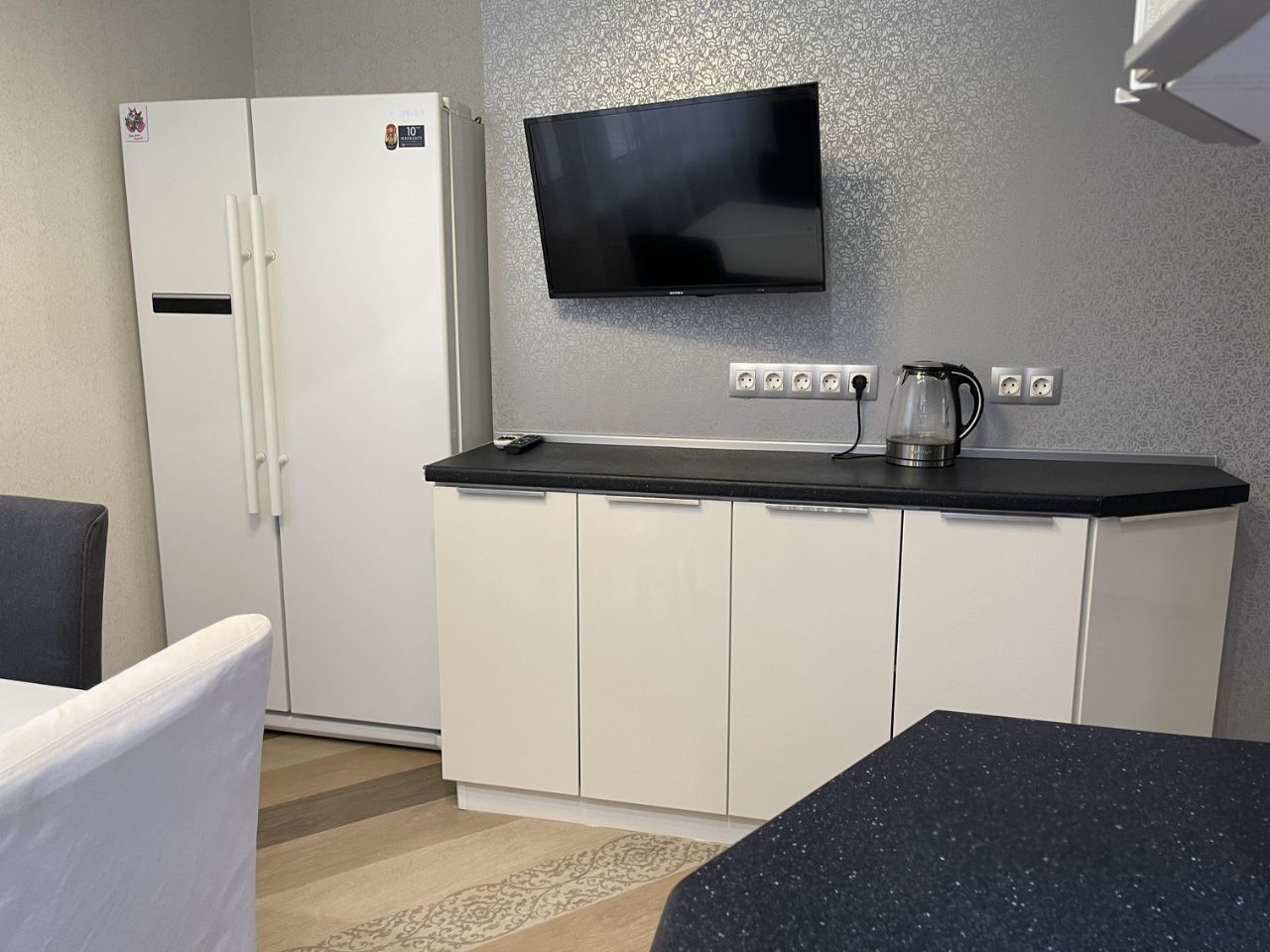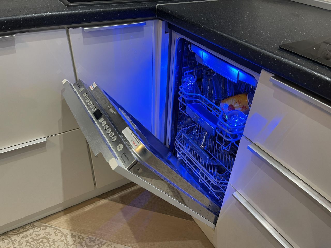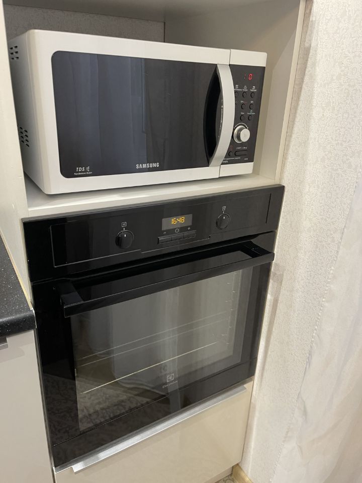 На кухне посудомоечная машина Bosch, индукционная плита и духовой шкаф Electrolux, двухстворчатый холодильник side-by-side Samsung, микроволновая печь, система фильтрации воды с обратным осмосом. Есть посуда и приборы.
