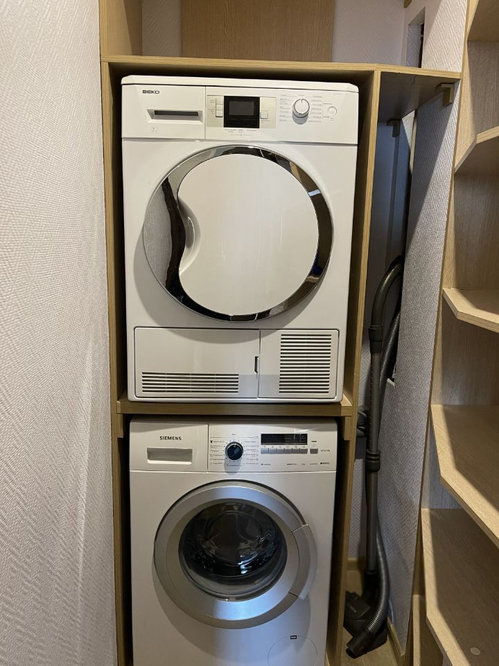Подсобная комната с большим местом для хранения вещей, сушильной машиной и стиральной машиной Siemens.