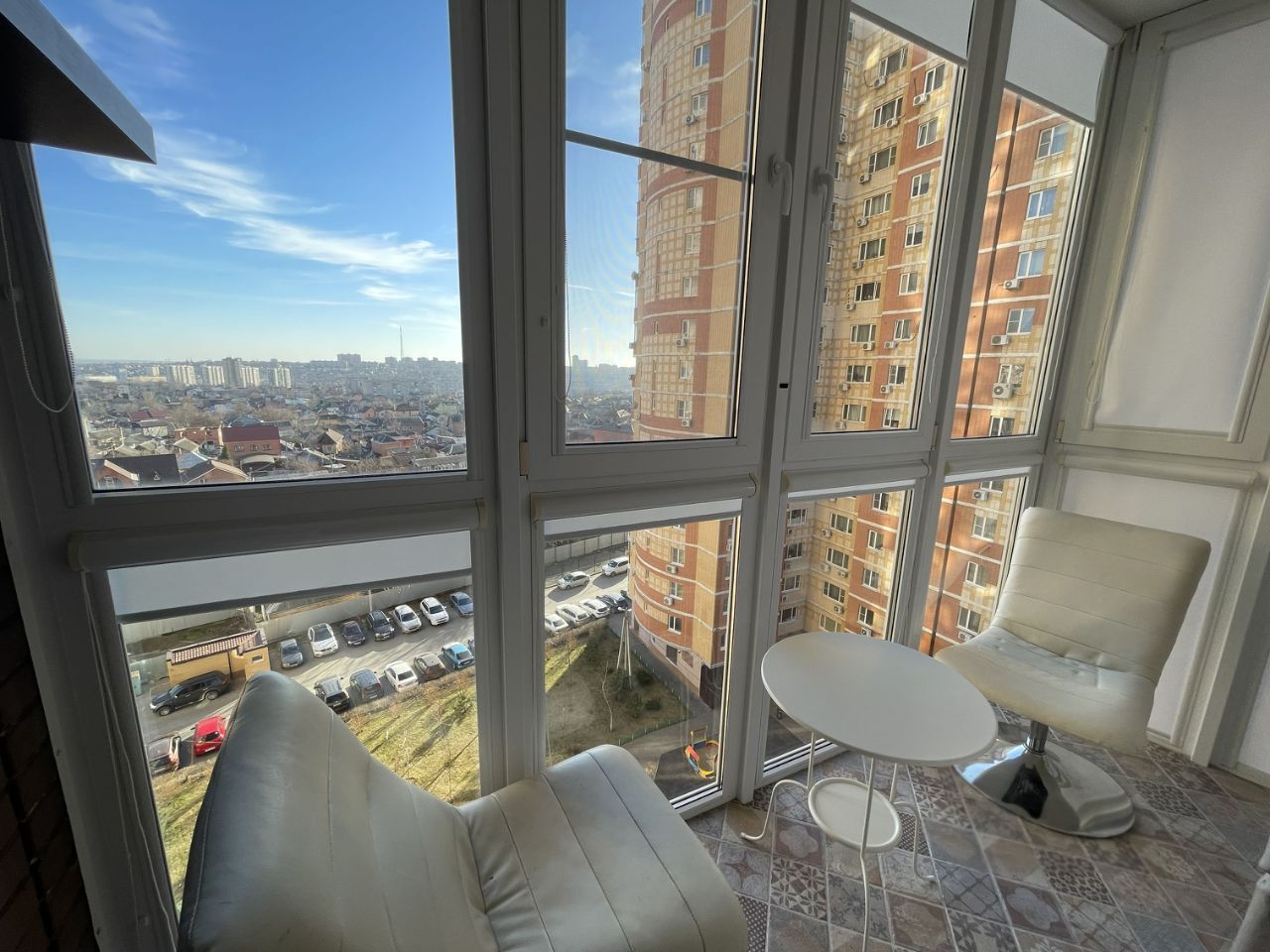 В зале большой раскладной диван и выход на панорамную лоджию.